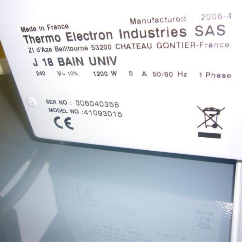 Bain-marie en inox JOUAN, modèle J18, capacité 4 litres, puissance 1200 W. Fabrication 1997, numéro de série 3060400356. Idéal pour applications de chauffage et maintien en température au laboratoire.