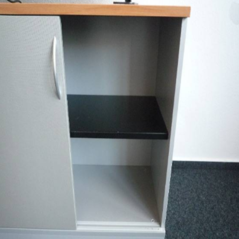 Meuble de rangement couleur argent, équipé de 2 portes coulissantes verrouillables par clé. Dimensions : 120 × 44 × 80 cm.